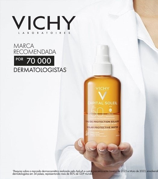 Protetor solar corporal iluminador. Vichy Capital Soleil FPS50 protege a pele dos raios solares, enquanto prolonga o bronzeamento.